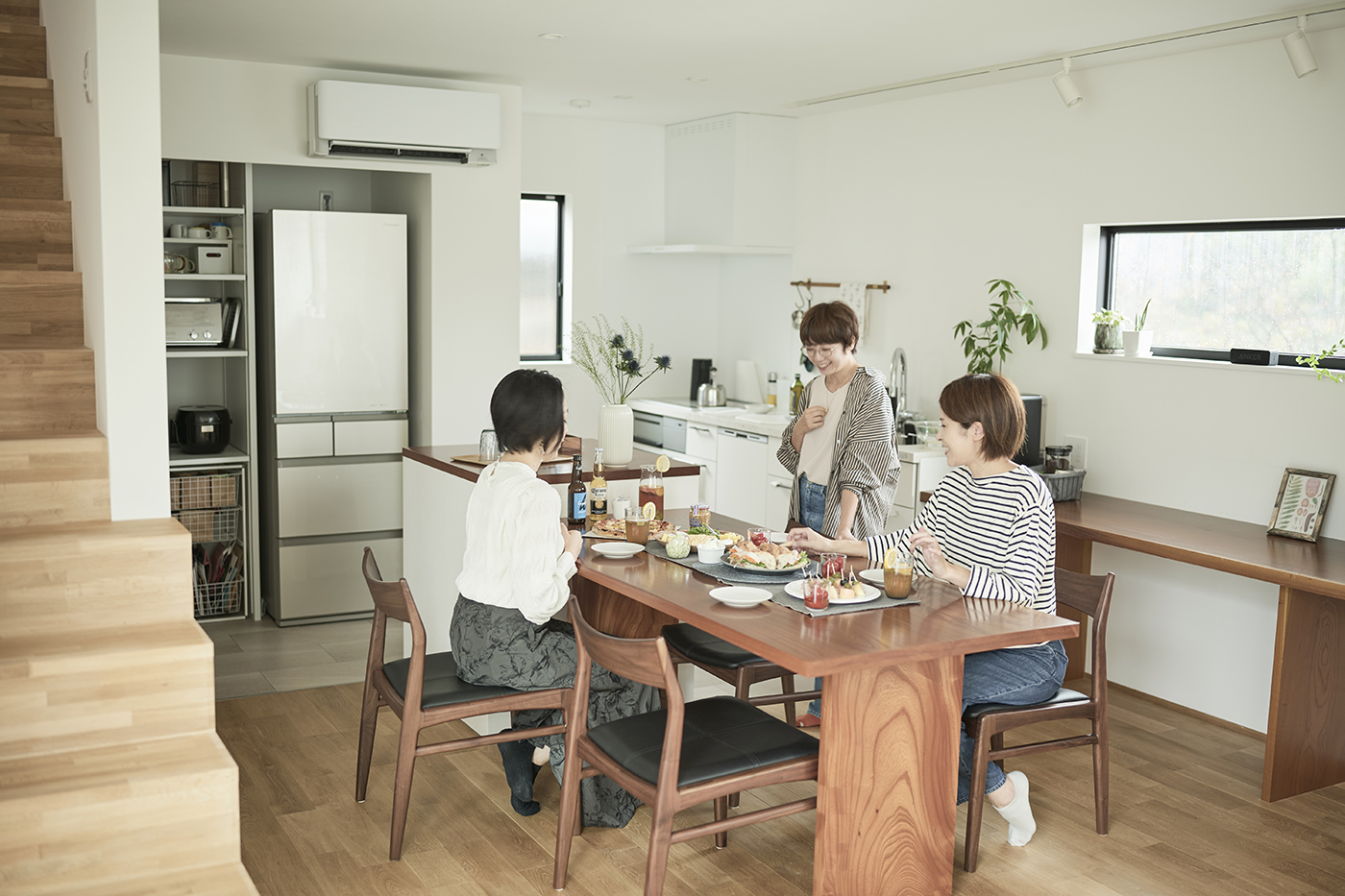 家族が自然と集まり、並んで食事をし、ときには一緒に準備をする。その場面を思い浮かべながら、キッチン、冷蔵庫、収納などをテーブルのまわりにレイアウトしていきました。支度も片付けも、みんなで役割を分け合いながら。そんな動線の提案が、クライアントの思い描く“暮らしの風景”にぴたりとはまりました。