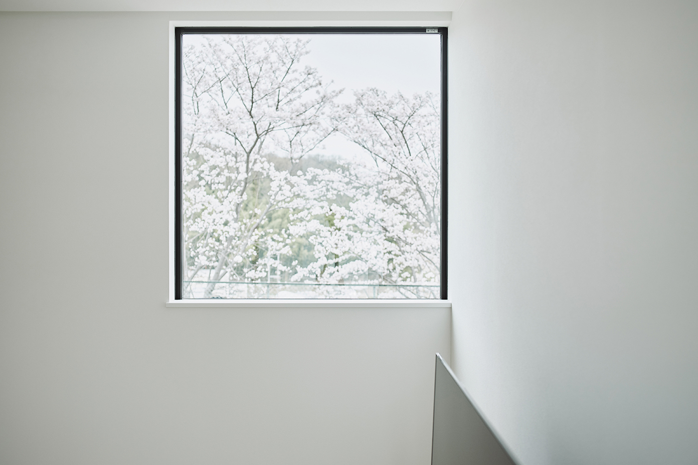 北側の角に設けた大きな窓の先には、季節ごとに彩りを変える桜並木と、クライアントが自分たちで植えたアオダモ。食卓に座ると、風にそよぐ葉の動きや、春の花の気配が自然と目に入ってきます。視界の抜けが、日々の生活を少しだけ特別な時間にしてくれているようです。