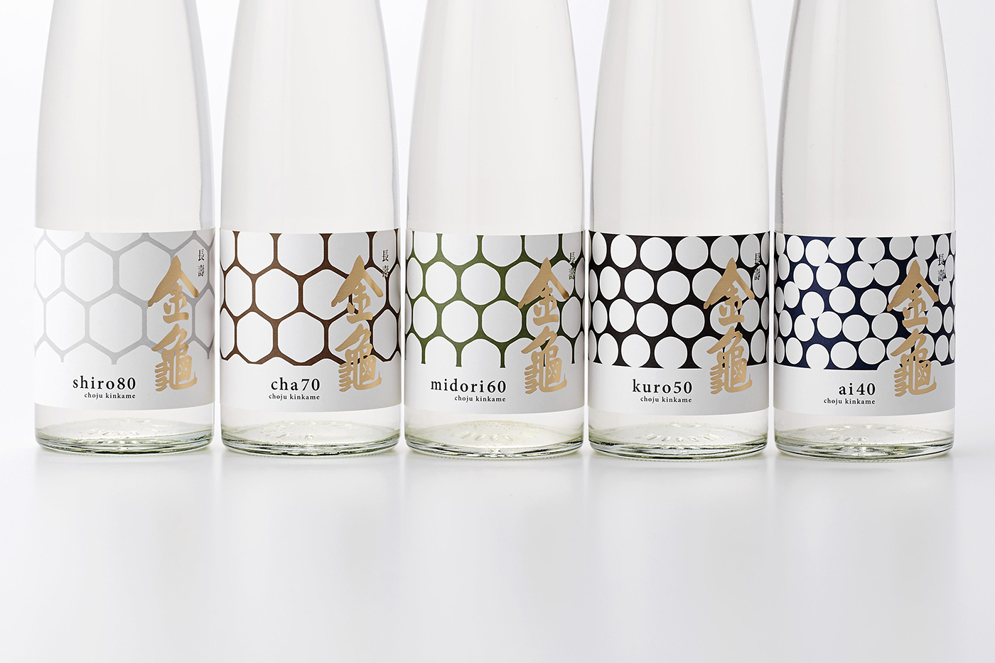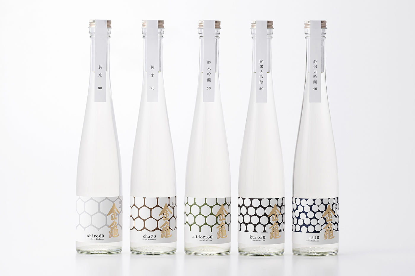 ブランドの「亀」を「米」に見立て精米歩合によって米が磨かれ少しづつ丸くなる様子と