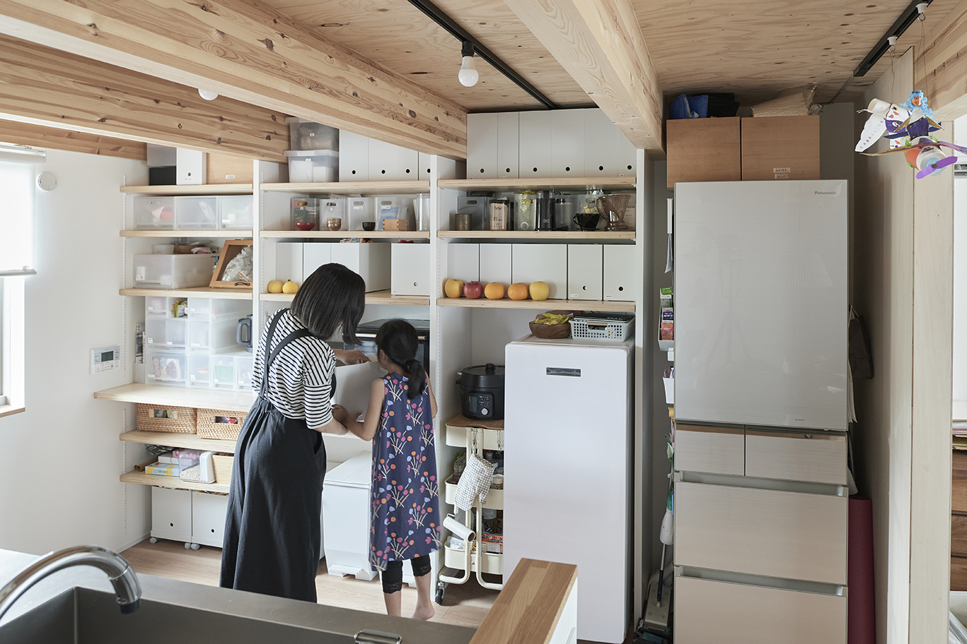 メガホンのようにするために必要だった耐力壁は敢えてリビングにポンとおいています。一見邪魔な壁なのですが、そこに小窓を開けることで視線が抜けたり飾り棚になったりと、家具のような存在になりました。