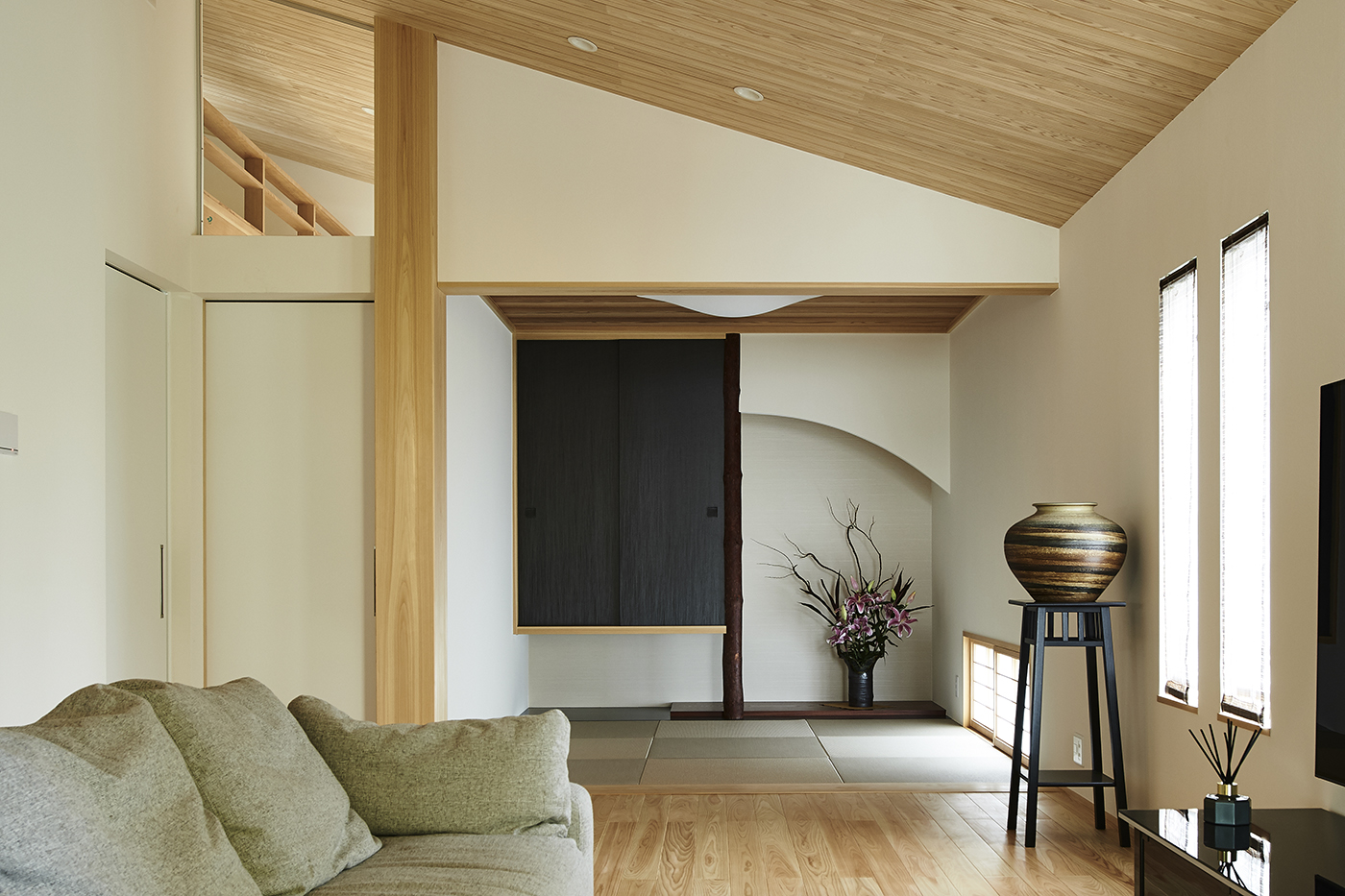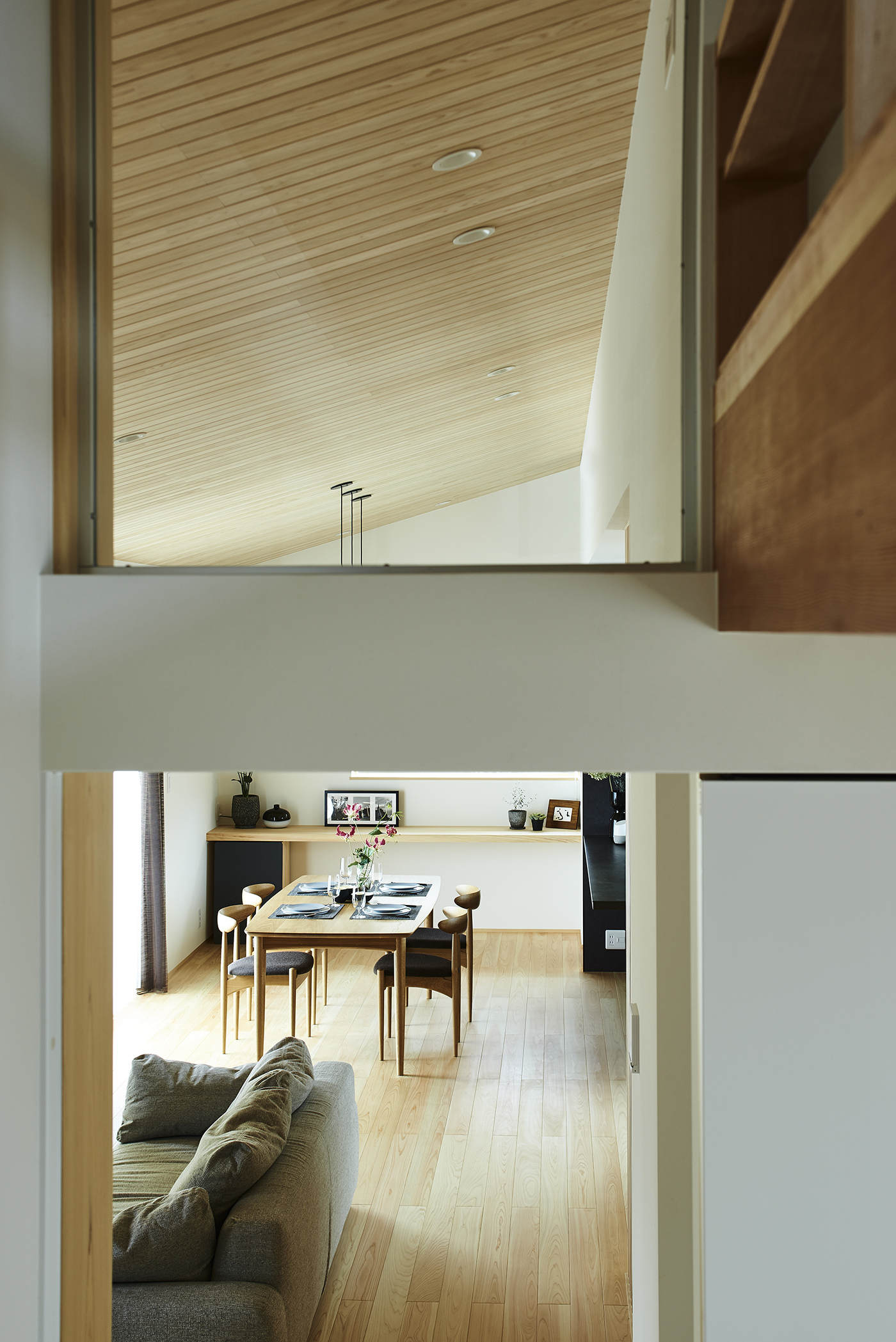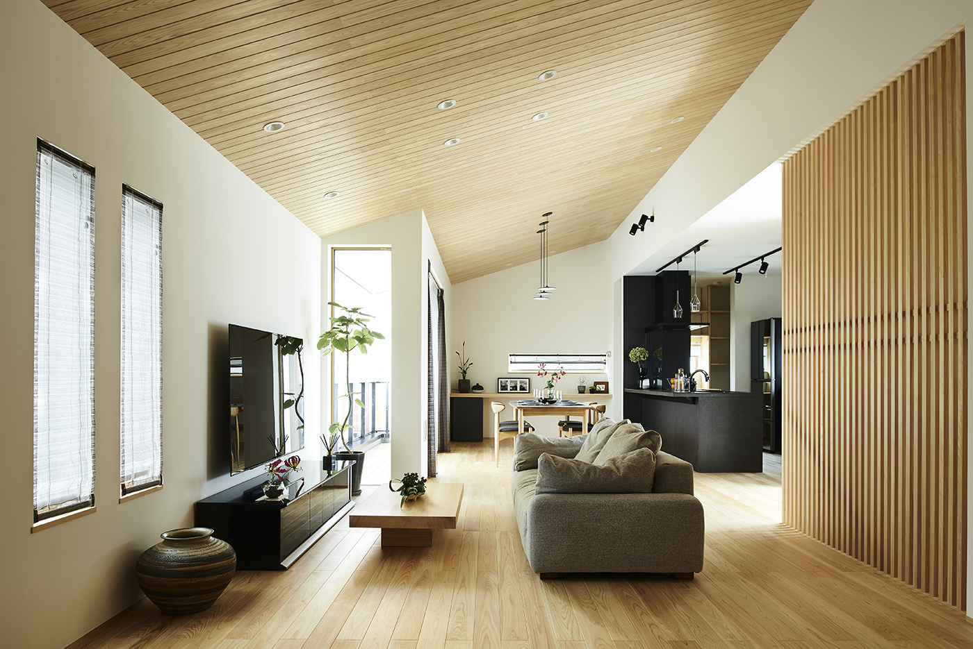 勾配天井のゲストルームには床と天井、ルーバーに無節の材を使うことで木の温かみを感じる空間に。要所を黒で引き締めることでモダンな印象も同時につくり出しています。
