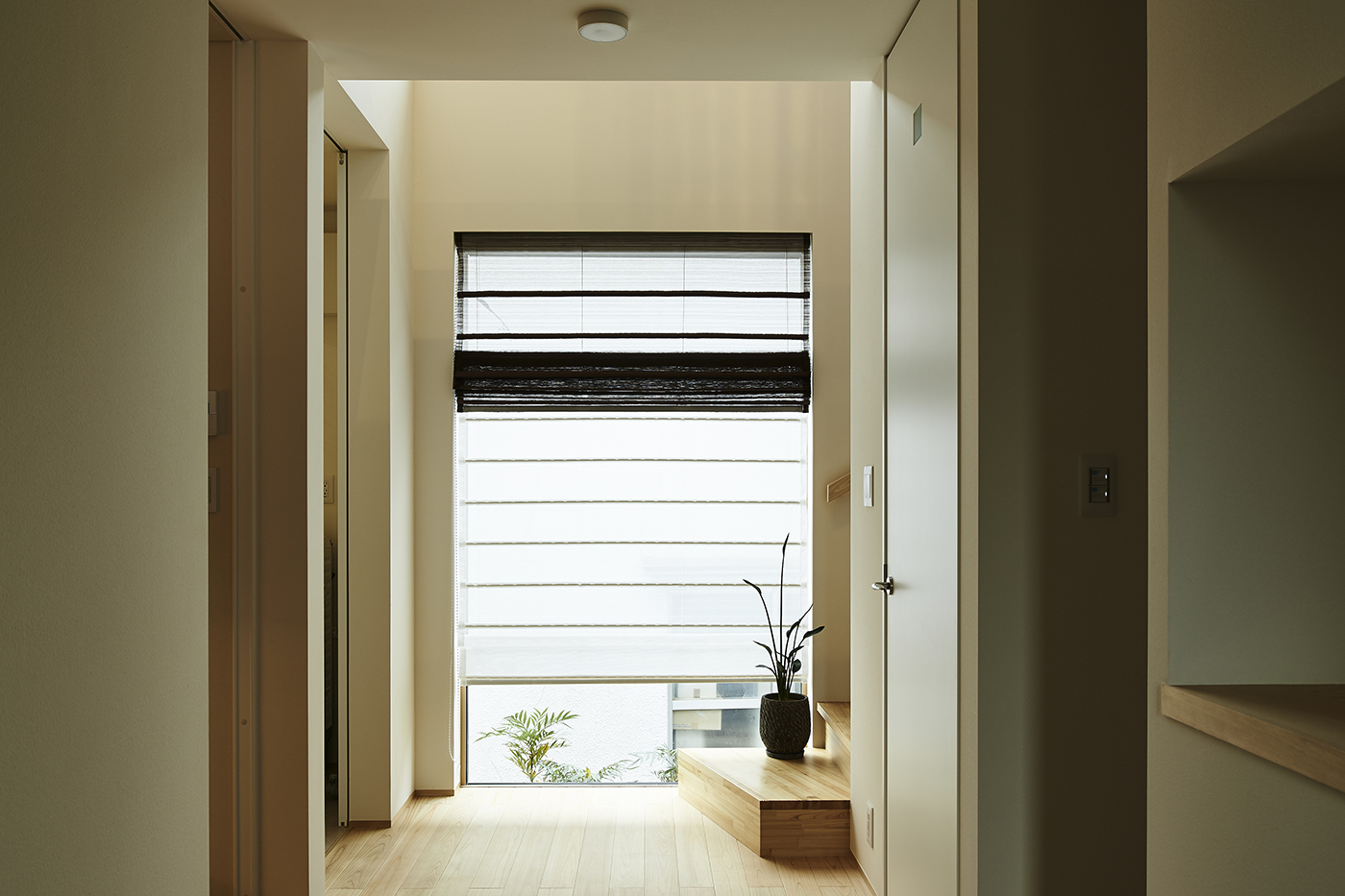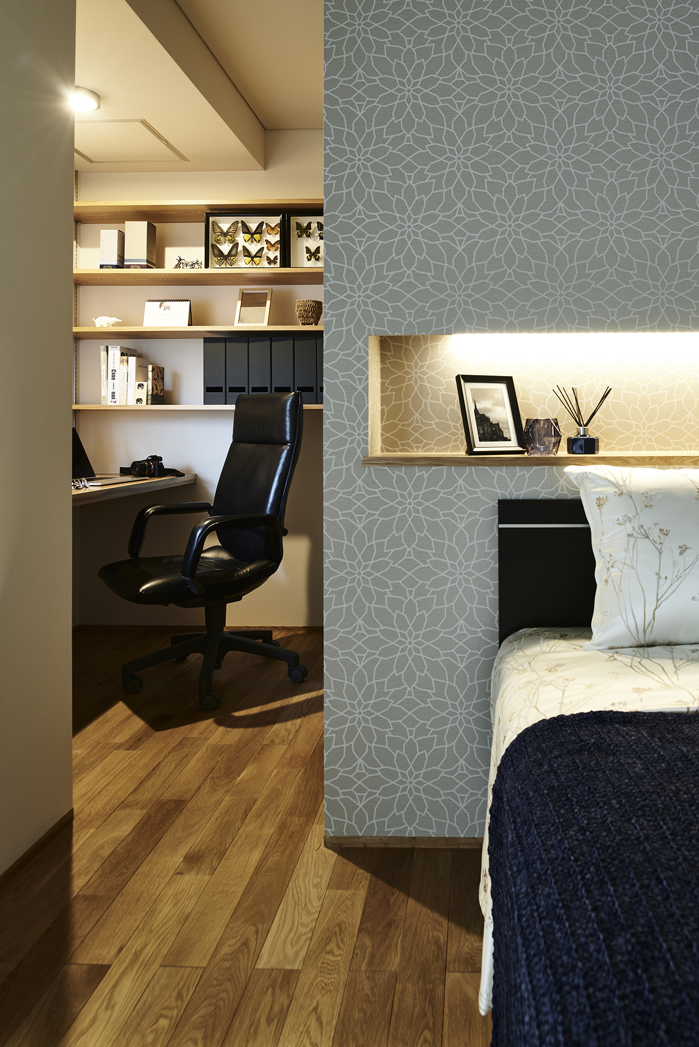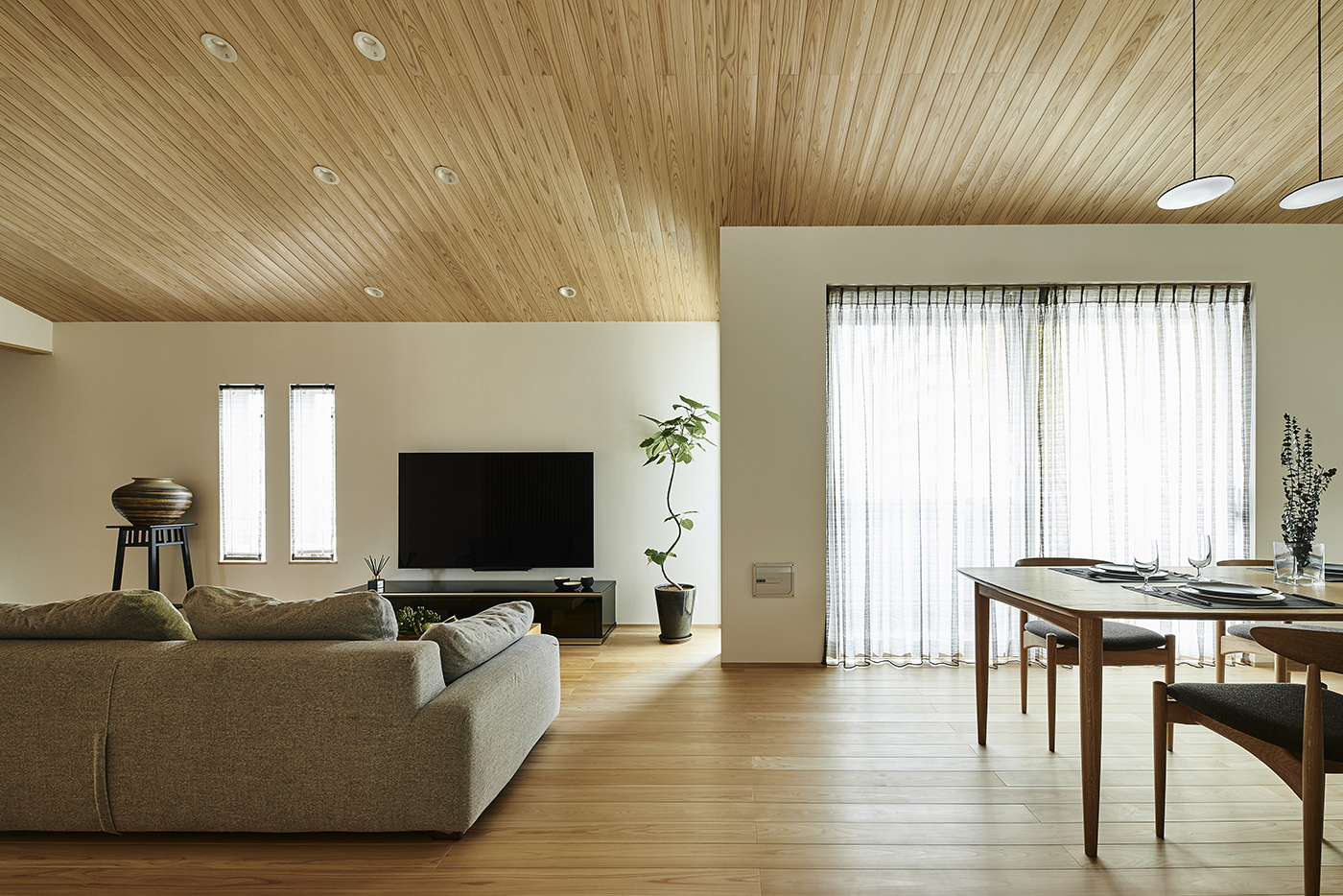 勾配天井のゲストルームには床と天井、ルーバーに無節の材を使うことで木の温かみを感じる空間に。要所を黒で引き締めることでモダンな印象も同時につくり出しています。
